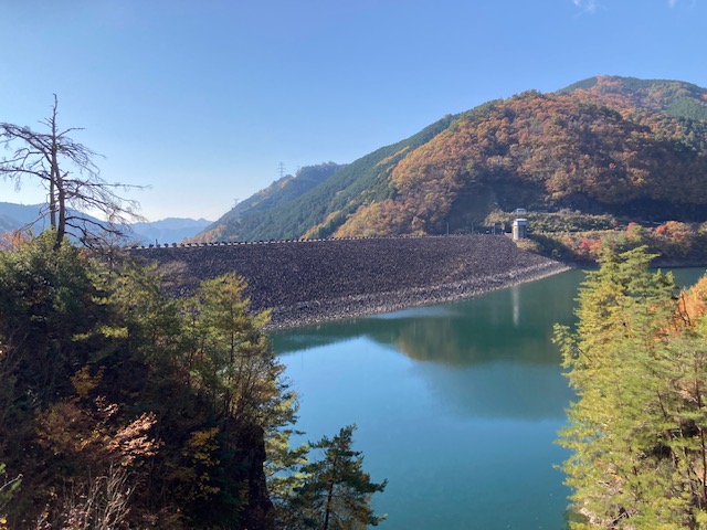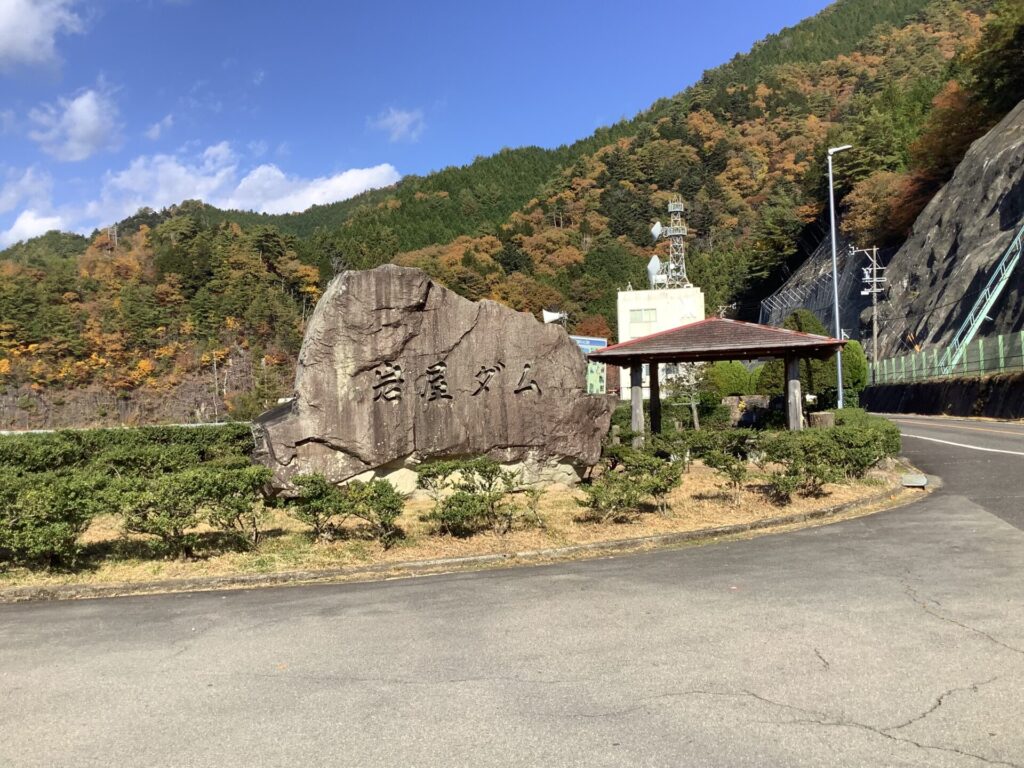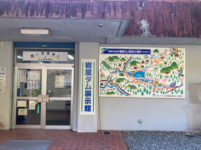 紅葉に包まれた馬瀬川沿いを進むこと約40分。最初の目的地である岩屋ダムに到着しました。ここには秋に何度か来たことがあります。しかし、今回は普段通り過ぎてしまう展示施設が気になり、初めて立ち寄ることにしました。