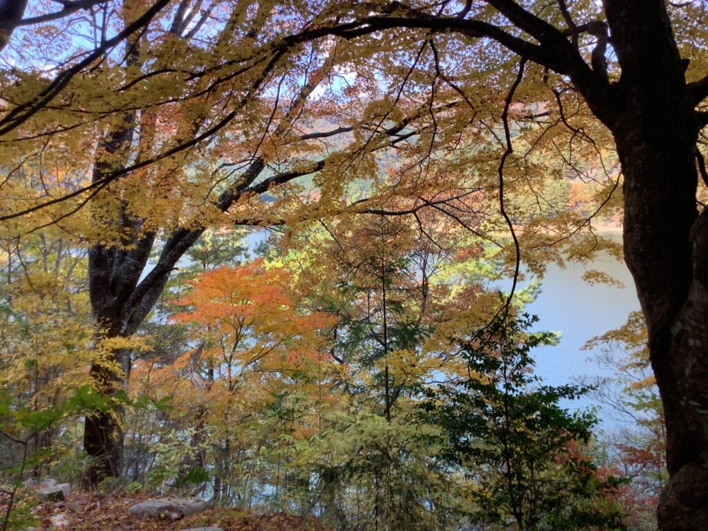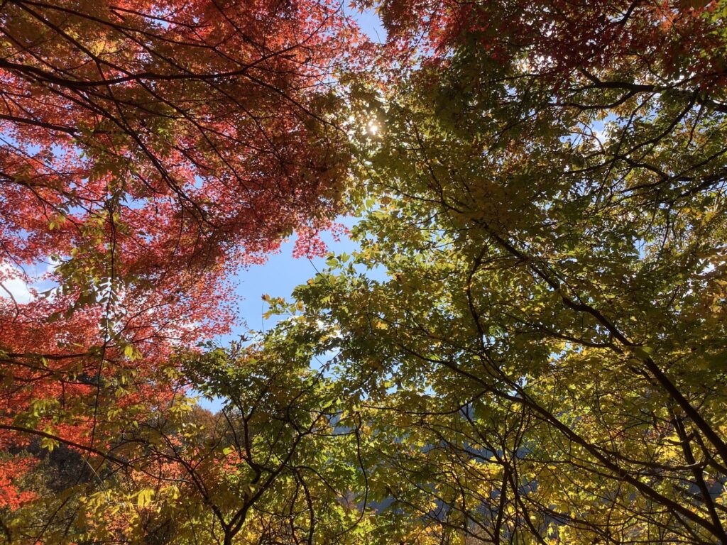 まず、この道中が想像以上に美しく、改めて驚きを覚えました。というのも、赤や黄色に染まった木々が長く続き、途切れることがほとんどないからです。太陽の光が葉に透ける瞬間は特に印象的で、車を停めたくなる場所が次々と現れました。