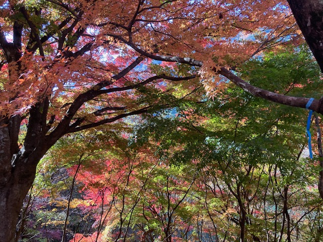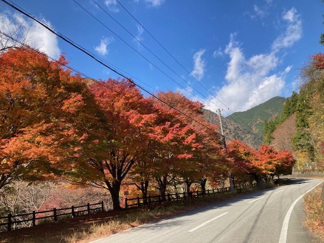 さらに、北側ではすでに紅葉が終わりかけでしたが、南に向かうこの道はちょうど見頃でした。車通りも非常に少なく、紅葉の穴場といえる場所です。