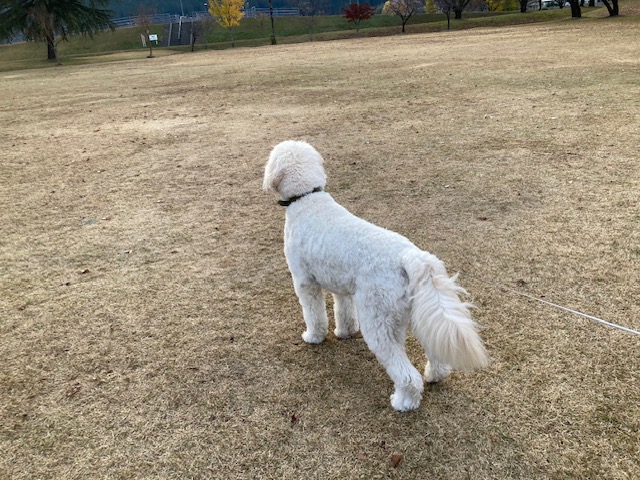 金山巨石群を見たあとは帰路につきましたが、まだ時間が早かったため、飛騨川公園にも立ち寄りました。そこで、数日前に見かけた白い大型犬と再会しました。
