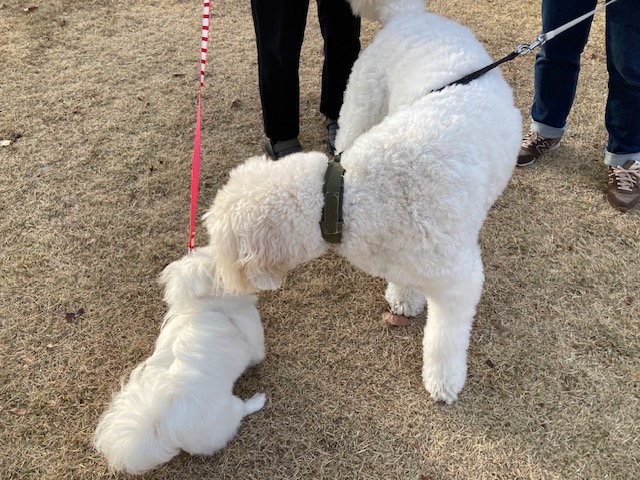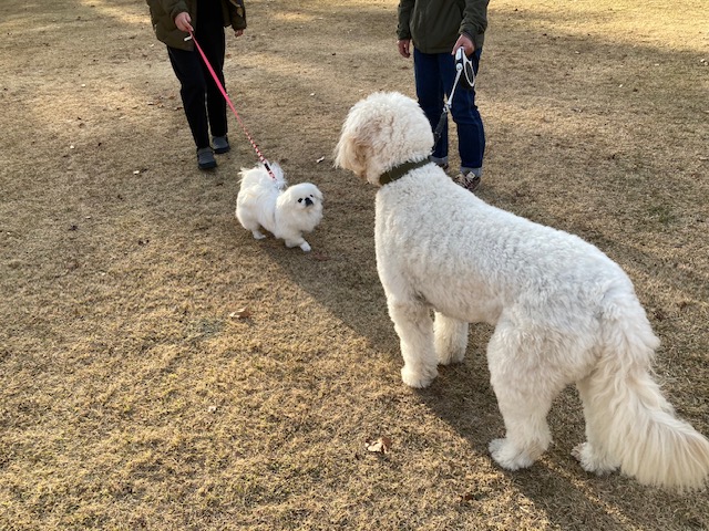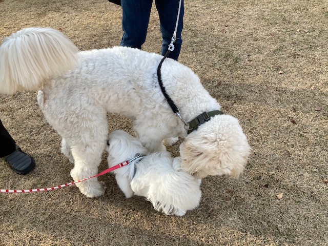 その後、マシューは遠くを見つめてじっと立ち止まりました。不思議に思っていると、子犬を連れた女性がゆっくりと近づいてきました。初対面か否かは知りませんが、2匹が戯れる姿は、とても微笑ましく、しばらく見入ってしまうほどでした。