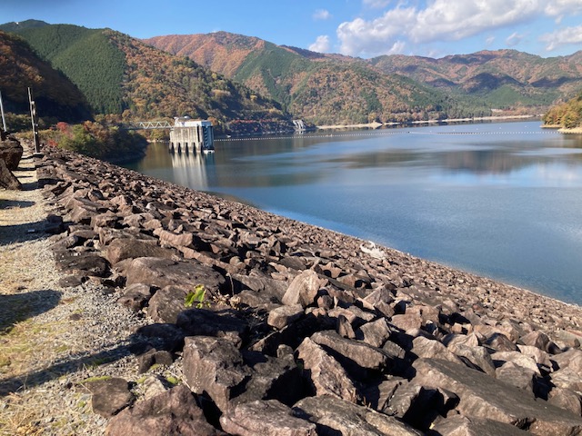 紅葉に包まれた馬瀬川沿いを進むこと約40分。最初の目的地である岩屋ダムに到着しました。ここには秋に何度か来たことがあります。しかし、今回は普段通り過ぎてしまう展示施設が気になり、初めて立ち寄ることにしました。