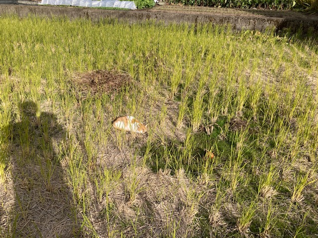 家を出てしばらくは平坦な道が続きますが、10分もすると坂道が始まります。道中、田んぼの真ん中で稲わらの上に丸くなり昼寝している猫の姿を見つけ、思わず立ち止まりました。こうした出会いは、歩く旅ならではの魅力です。