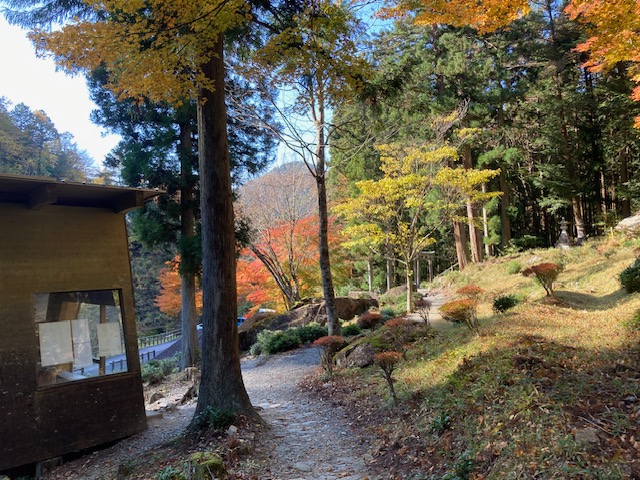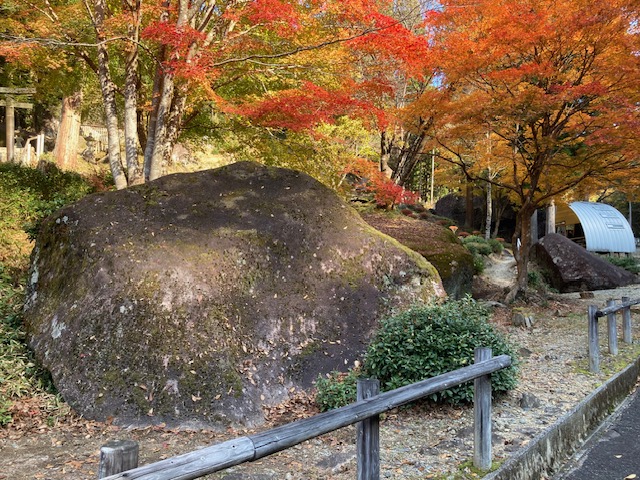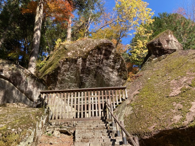 昨日11月17日、下呂市の岩屋ダムで紅葉を楽しんだ帰りに、以前から気になっていた金山巨石群へ向かいました。岩屋ダム沿いの 岐阜県道441号(岩屋ダム線)を車で岩屋ダムから南へ5分ほど下った場所に、小さな案内板が静かに立っています。そこから川沿いの細道を数分下ると、観光地とは無縁の深い静寂の中に巨石群が姿を現します。