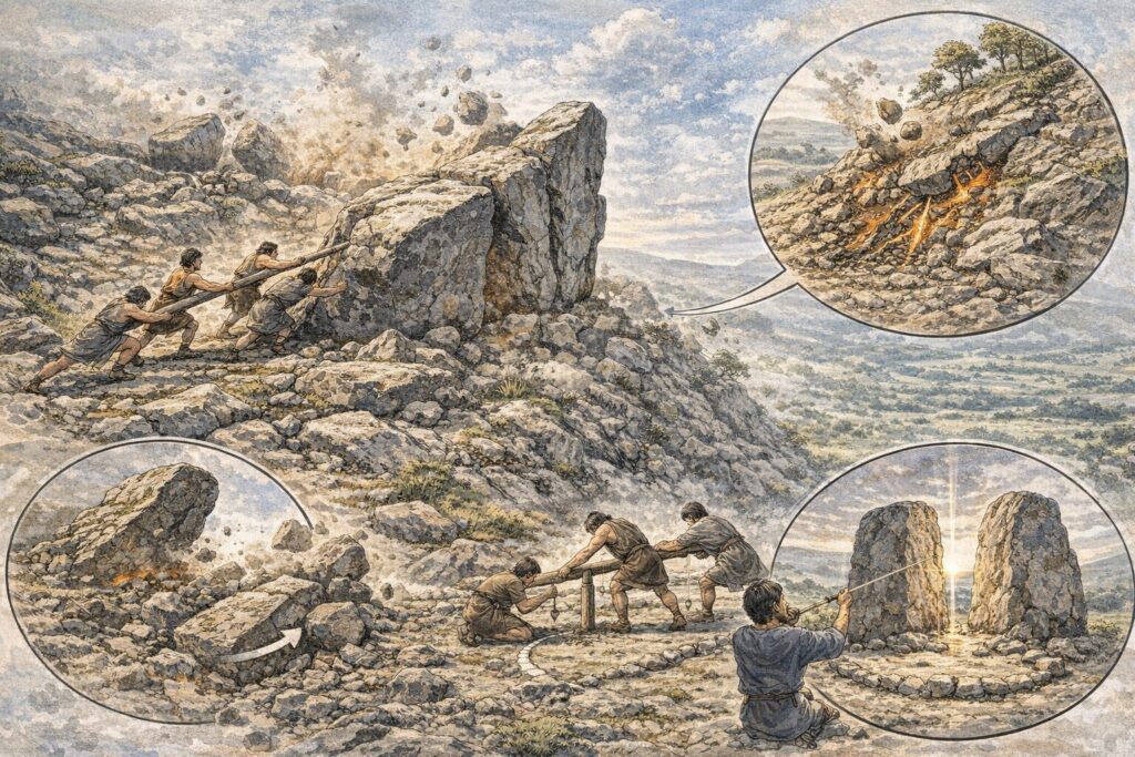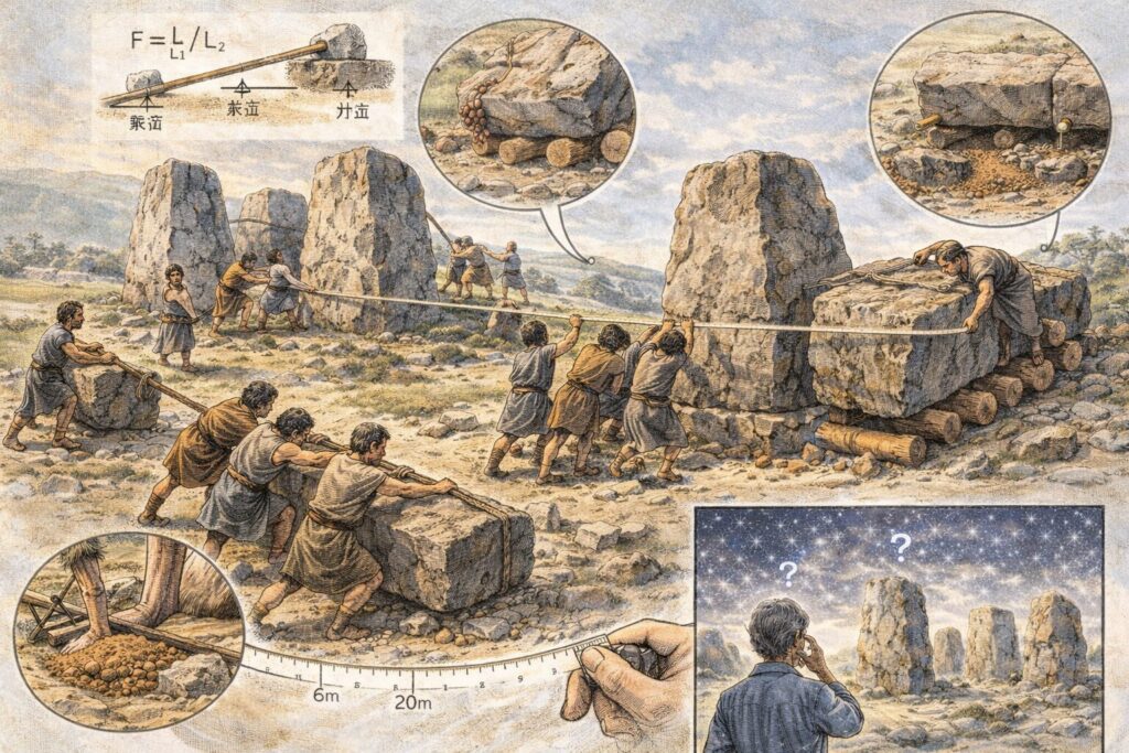 自然の素材を起点に、高度な物理学と組織力で構築されました。梃子(てこ)や丸太ローラー、摩擦を減らす粘土を用いれば、人力でも移動は可能です。特に石を揺らして隙間を埋める「ロッキング工法」は、重機のない時代に有効な手段でした。数世代にわたる観測に基づき、数センチ単位で配置を整えた「精密な建築」の結果といえます。