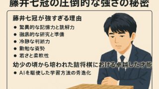 藤井六冠の圧倒的な強さの核心には、柔軟な発想があります。AIを駆使した研究、詰将棋で磨かれた読みの力、そして常識にとらわれない柔軟な発想こそが、彼を唯一無二の棋士へと押し上げています。本記事では、AI分析と筆者の視点の両面から、藤井六冠の柔...