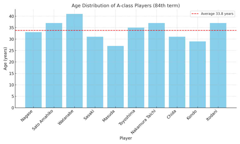 第84期(2025年度)のA級在籍棋士10名の平均年齢は 33.8歳 です。横軸に棋士名、縦軸に年齢をとると、トップ棋士たちの中心は 30代前半 にあり、全盛期は20代後半から30代前半に集中していることがわかります。40代を過ぎてA級を維持するのは極めて難しく、年齢とともに実力が衰えるという現実を将棋界のデータが如実に示しています。