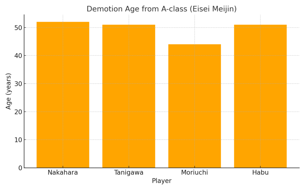 このデータが示すように、永世名人と呼ばれる一流棋士であっても、A級に在位できるのは多くの場合20〜30期前後に限られ、年齢にして50代前半が限界となっています。